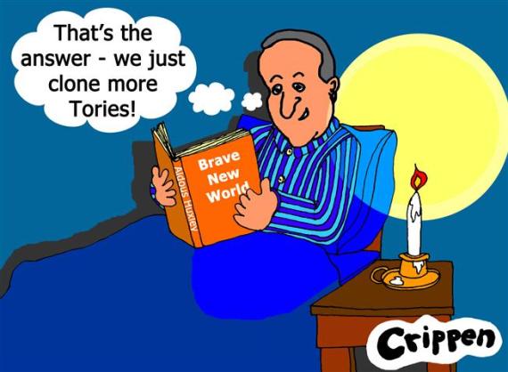 For a while now I’ve had a cartoon in the back of my head about Cameron and his taste in bedtime reading. I’ve imagined him reading books by Aldous Huxley and George Orwell, both of whom wrote of futuristic worlds where people are cloned and programmed to accept their designated place in society; upholding the status quo and not challenging the ‘news’ that originated through government approved media sources, etc.