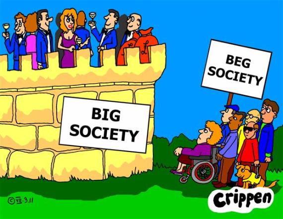 You’re right. My intention is to get reactions to my cartoons and this one in particular seems to have worked. Perhaps the cartoon can be interpreted in another way; that the Tory government are working at creating two societies – A Big Society and a Beg Society – with the Beg Society comprising of all of us who are on state pensions, benefits and other care services? Nothing is as it seems with a Crippen cartoon!