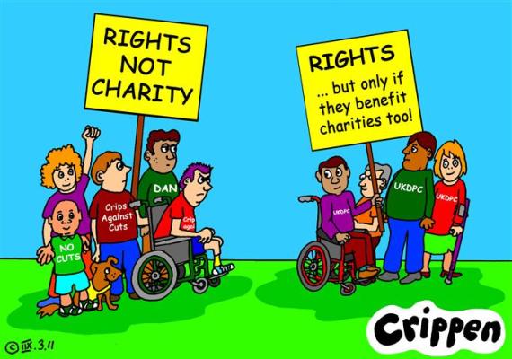 We’ve already seen how the big disability charities are being geared up to act as the sole representatives of disabled people in the UK (see my blog on 6th Jan ‘Wolves in more sheep’s clothing’), a move that will take disabled people back 30 or more years when the fight for ‘rights not charity’ first took a hold amongst the disabled people’s movement.