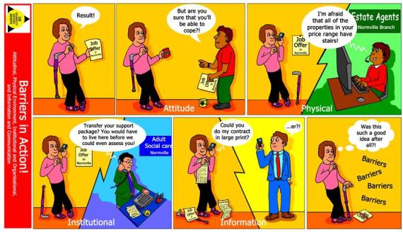 For those of you unfamiliar with the social model/barriers concept, here is a cartoon that I recently produced for the Disability History Month organisation.