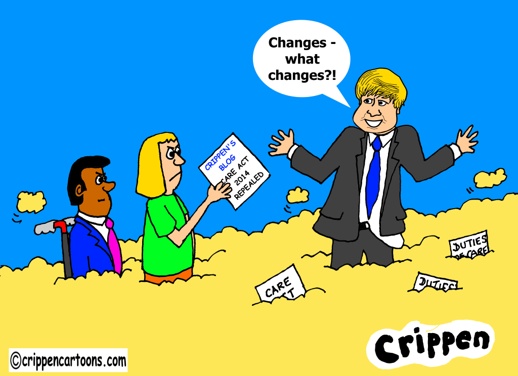 Boris Johnson is standing thigh deep in a yellow fog. Standing with him are two disabled people one of whom is holding up a piece of paper that reads ‘Crippen’s Blog Care Act 2014 repealed’. In the fog are the tips of papers reading ‘duties of …’ Boris is saying: “Changes – what changes?!”