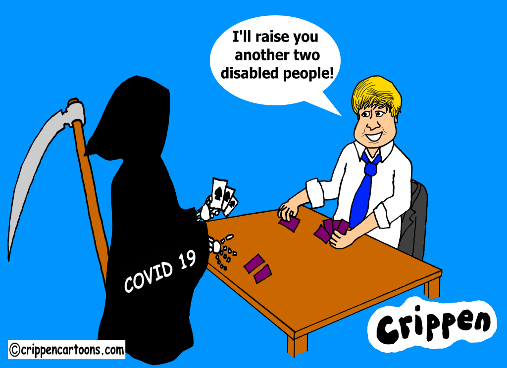 Boris Johnson is playing cards with the Grim Reaper who has ‘Covid 19’ printed on its side. Boris is saying: “I’ll raise you another two disabled people!”