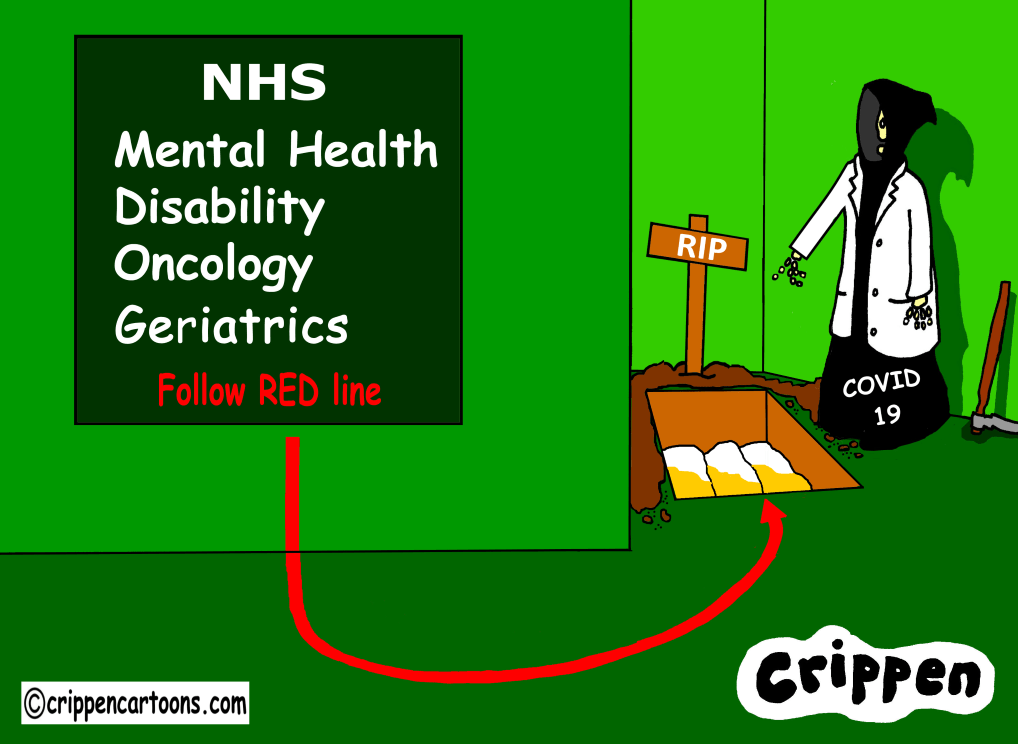 On the wall within a hospital is a large sign that reads ‘NHS – mental health, disability, oncology, and geriatrics’ and ‘follow the red line’. A red line then runs from the sign, along the floor and around the corner where the Grim Reaper, wearing a doctor’s white coat, is waiting alongside an open grave. There are wrapped bodies inside of the grave with a large wooden cross with RIP printed upon it at the head of the grave. The Grim Reaper has ‘COVID 19’ printed on his black gown and is pointing into the open grave.