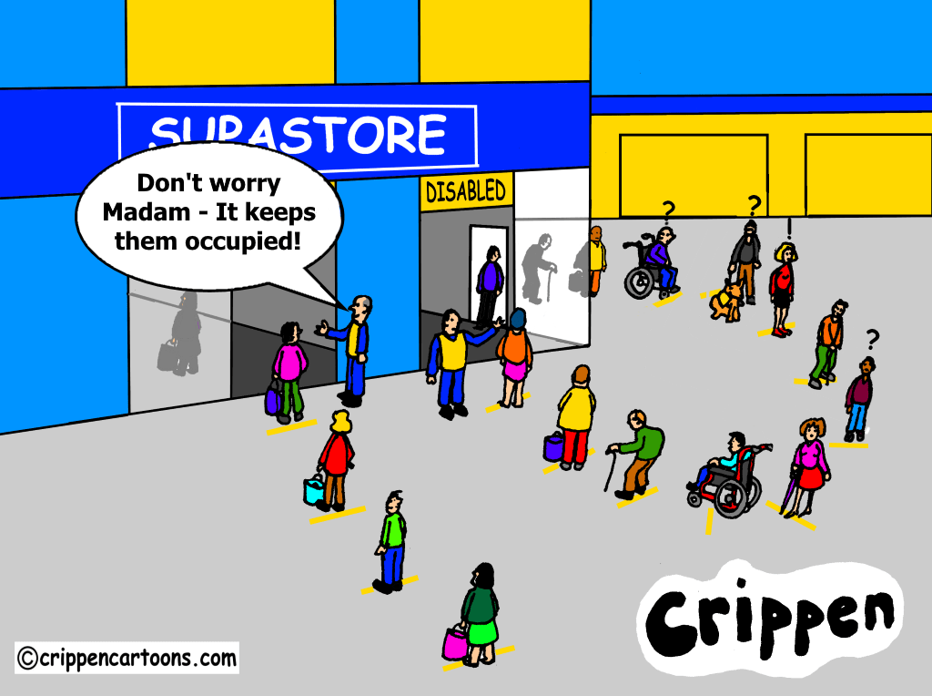 The scene is the entrance to a large supermarket, called Supastore in the cartoon. There is a queue of people waiting, socially distanced, leading up to a door marked ‘normal’. A man in a high viz tabard is allowing them to enter one at a time. Alongside of them is another queue, but these are disabled people with varying impairment issues. They are being guided through a separate door marked ‘disabled’ by another man in a high viz jacket. You can see that the disabled shoppers are being shown to another door inside of the entrance which brings them outside again – re-joining the queue of disabled people. The disabled shoppers are therefore not making it into the shopping area of the store but are walking in a large circle, effectively getting nowhere. The man in the high viz who is policing the ‘normal’ entrance is saying to a customer: “Don’t worry Madam – it keeps them occupied!”
