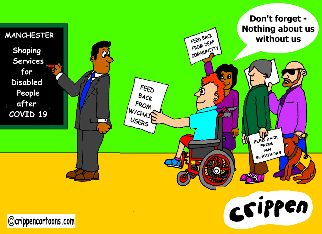 A large, representative group of disabled people are holding up the results from the Greater Manchester Covid 19 survey. In front of them is an Asian man in a grey suite and blue tie who is writing on a blackboard. He has written ‘Manchester shaping services for disabled people after Covid 19’. He is also looking over his shoulder at the group of disabled people, one of whom is saying: ”Don’t forget – nothing about us without us!”