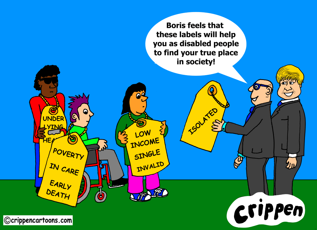 Several disabled people representing a cross section of impairments and ethnicity all have large labels hung around their neck. The labels read ‘Poverty, In care, early death, low income, single, invalid and underlying health conditions. A civil servant is holding out another label which has ‘Isolated’ printed upon it. Alongside of him stands Boris Johnson with a smile on his face. The civil servant is saying to them: “Boris feels that these labels will help you as disabled people to find your true place in society!”