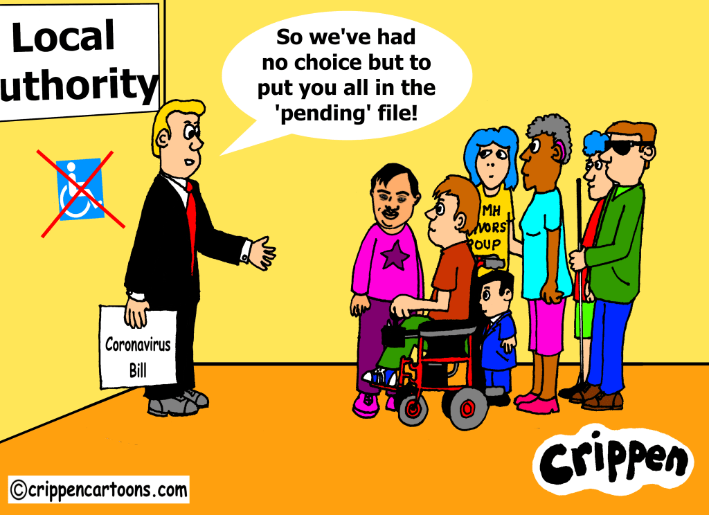 A group of disabled people representing differing ethnicities and impairments are confronting a white male in a suit. Behind him is a large sign identifying him as belong to the local government. There is also a blue wheelchair symbol with a red cross through it. The man is also holding a document that reads ‘Coronavirus Bill’. He is saying to the disabled people: “So we’ve had no choice but to put you all in the ‘pending’ file!”