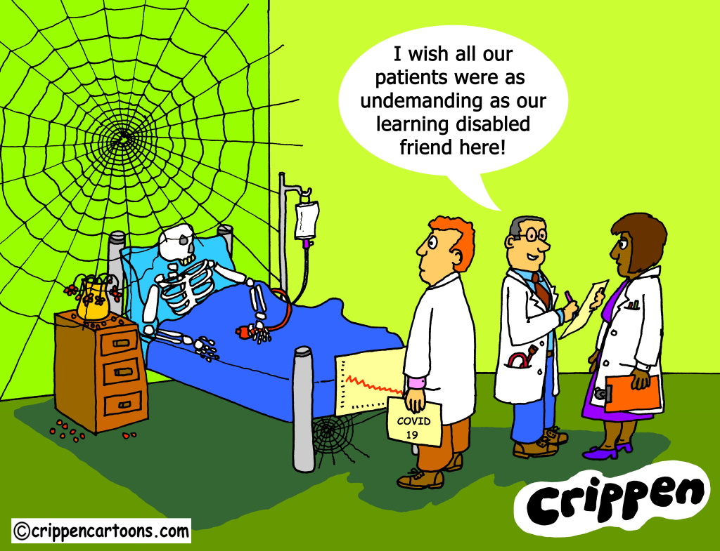 The scene is a hospital ward with a single bed containing a skeleton. The skeleton is holding an alarm button and a spider has woven a large web across it and the bed. A vase of dead flowers sits on the bedside table with petals all over the floor. Three people in white coats are standing at the foot of the bed. One of them is holding a document called ‘Covid 19’. Another is writing on a clip board and is saying to his colleagues: “I wish all of our patients were as undemanding as our learning disabled friend here!”