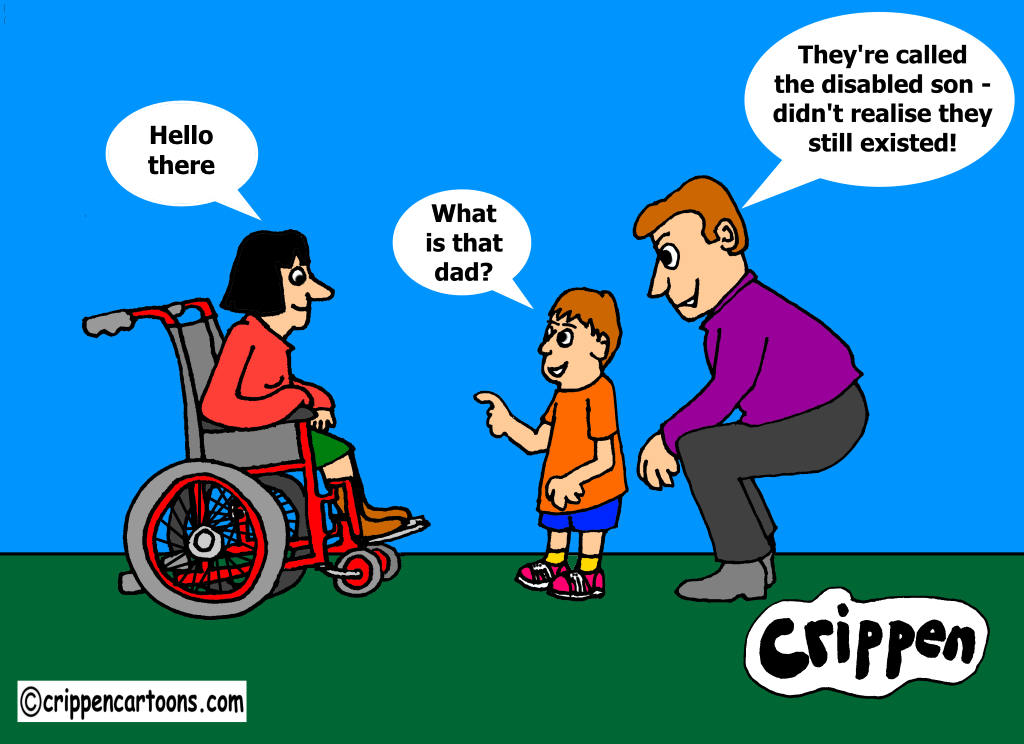 A young female wheelchair user is saying hello to a little boy. The boy is with his father and is asking him: “What is that dad?”. The father replies: “They’re called the disabled – didn’t realise they still existed!”