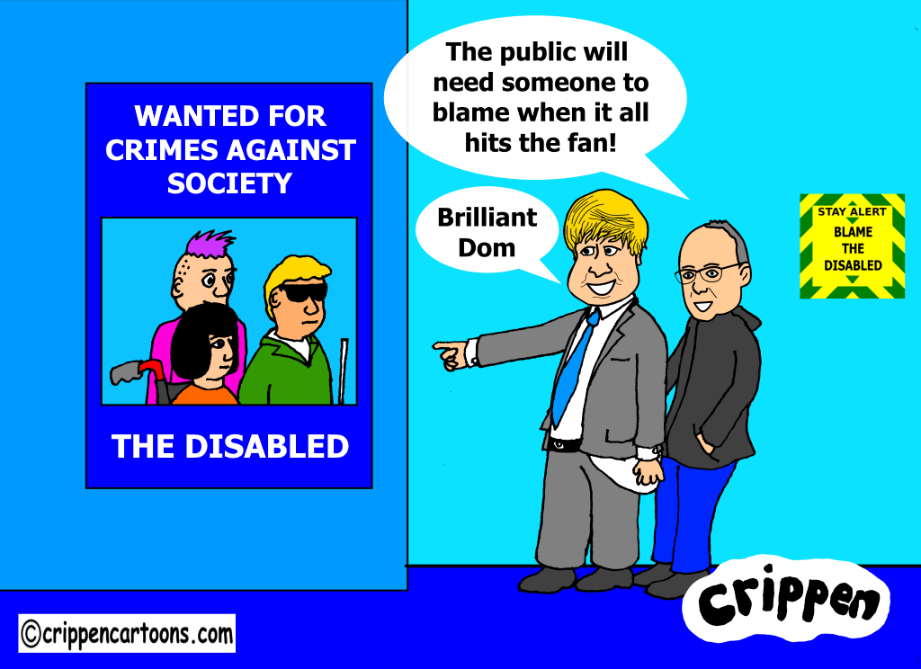 Boris Johnson and Demonic Cummings are standing looking at a large poster which has a group of disabled people on it. The poster reads ‘Wanted for crimes against society – The Disabled’. There is also one of the infamous ‘be alert’ signs on the wall amended to read ‘Be alert – blame the disabled’. Cummings is saying to Boris: “The public will need someone to blame when it all hits the fan!” Boris replies: “Brilliant Dom!”
