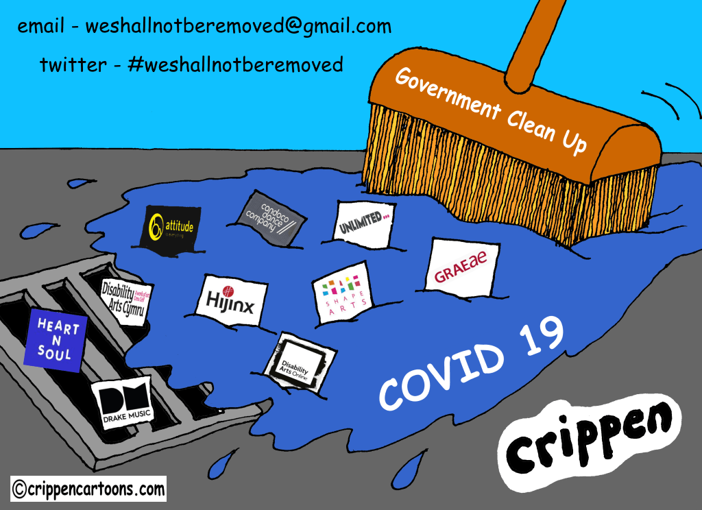 A large broom labelled ‘government clean up’ is sweeping a blue liquid down an open drain. The liquid which is identified as Covid 19, contains pieces of card representing disability arts groups and organisations and include Graeae Theatre, Candoco, Drake Music, Disability Arts Cymru, Access all areas, Shape arts, Hijinx and DAO. Across the top of the page is an email address – weshallnotberemoved@gmail.com – and a twitter hash tag that reads ‘weshallnotberemoved’.