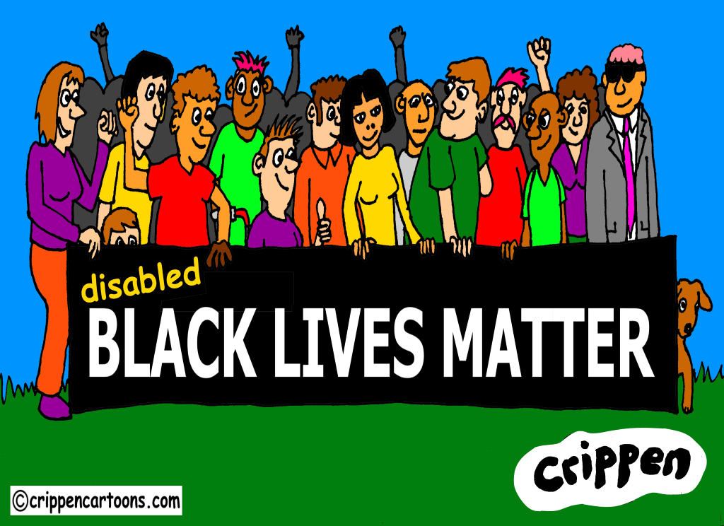 A large group of disabled people representing a wide range of impairments and ethnic diversities are standing behind a large banner that reads ‘Black lives matter’. The word ‘disabled’ has been added at the front of the lettering. A lot of the people are raising a clenched fist salute.