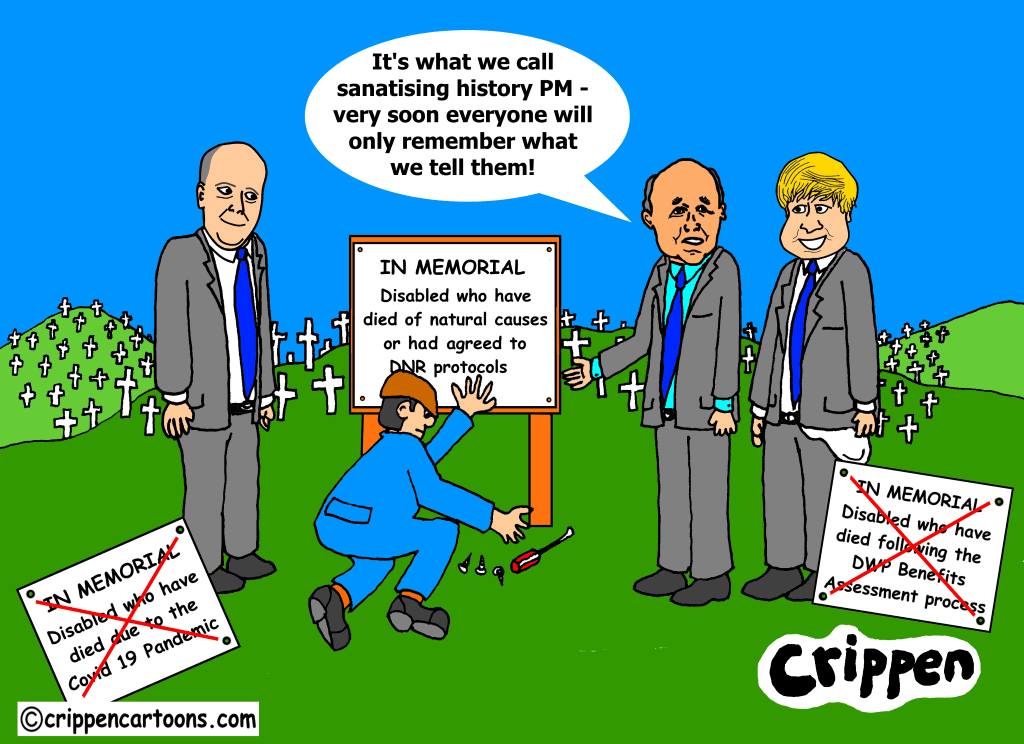 Iain Duncan Smith (IDS) and Boris Johnson are stood beside a workman changing a large sign in front of a cemetery. Opposite them stands Chris Greyling MP. The workman is fixing a new sign which reads ‘In memorial – disabled who have died of natural causes or had agreed to DNR protocols’. Discarded on the floor are two signs with big red crosses through them. The first one reads ‘In memorial – disabled who have died following DWP benefits assessment process’ and the second sign reads ‘In memorial – disabled who have died due to Covid 19 pandemic’. IDS is saying to Johnson: “It’s what we call sanitising history PM – very soon everyone will only remember what we tell them!”