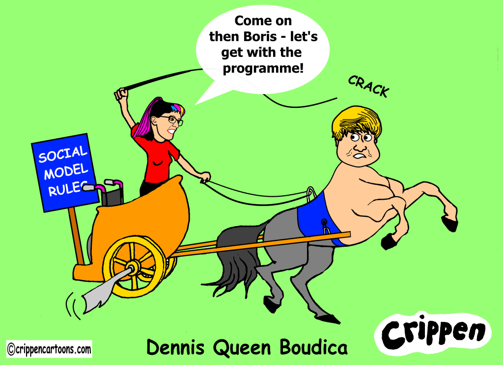 Disabled activist Dennis Queen is riding in a chariot in her wheelchair. The chariot has large blades projecting from the wheels and on the back has a large sign that reads ‘social model rules’. In the traces is a large flesh coloured horse with the head of Boris Johnson. He is grimacing as Dennis cracks a whip over his head and says: “Come on then Boris – get with the programme!” At the bottom of the cartoon it reads ‘Dennis Queen Boudica’.