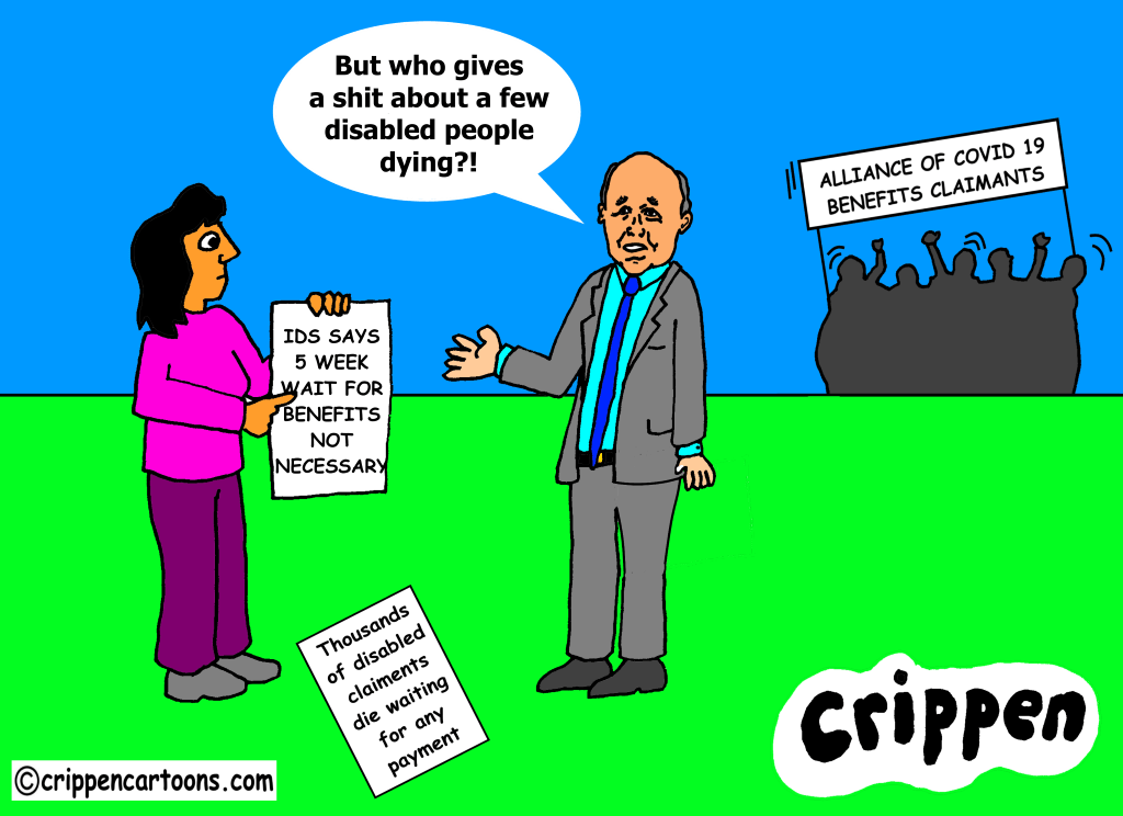 An Asian woman is standing in front of Iain Duncan Smith (IDS) and is holding a large sheet of paper that reads ‘IDS says a 5 week wait for benefit is not necessary’. On the floor at her feet is another sheet that reads ‘thousands of disabled claimants die waiting for payment’. IDS is saying to her: “But who gives a shit about a few disabled people dying?!”. In the background a large, angry mob is approaching. They are carrying a banner stating that they are ‘the alliance for Covid 19 benefits claimants’.