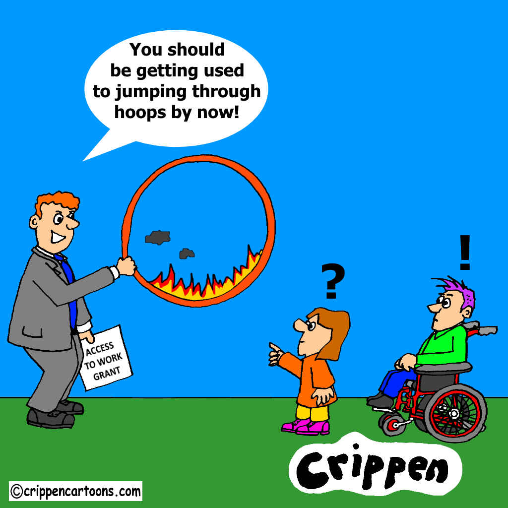 A white male in a grey suit is standing in front of two disabled people with a flaming hoop in his hand. His other hand is holding a form that reads ‘access to work grant’. The two disabled people, a woman of restricted growth and a male wheelchair user are looking perplexed. The man with the suit is saying to them: “You should be getting used to jumping through hoops by now!”