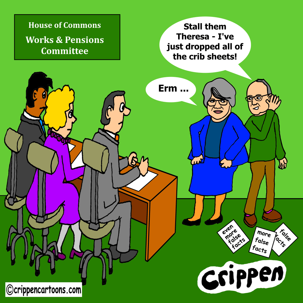 Theresa Coffey is standing in front of a row of seated officials in the office of the works and pensions committee. The committee members are all looking at her expectantly. She is saying: “Erm …”. Behind her is Dominic Cummings with pieces of paper around his feet which read ‘false facts’, ‘more false facts’ and ‘even more false facts’. He is whispering to her: “Stall them Theresa – I’ve just dropped all of the crib sheets!”.