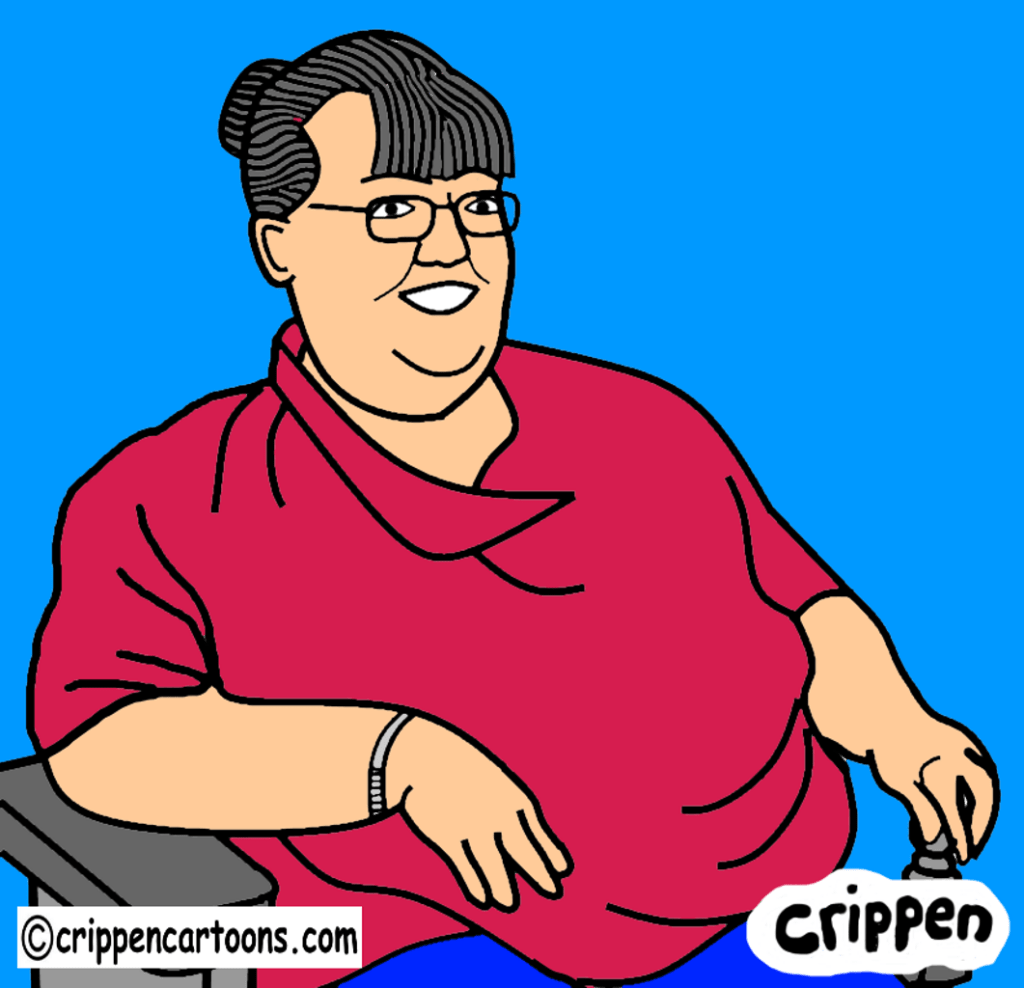 A caricature of Sian sat in her wheelchair with a cheerful smile on her face. She is wearing a dark pink top with blue tights and has a silver bracelet on her right wrist.