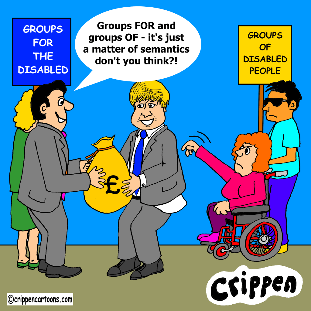 A white male and a white woman both smartly dressed in business suits are receiving a large sack of cash from Boris Johnson who represents the government. They carry a sign that identifies them as ‘groups for the disabled’. Behind Boris and trying to attract his attention, are two disabled people; a young white woman using a wheelchair and an Asian man who is wearing dark glasses and carries a white stick. They are both looking angry. They are identified by a sign that reads ‘groups of disabled people’. The male charity worker is saying to Boris: “Groups FOR and groups OF – it’s just a matter of semantics don’t you think?!”