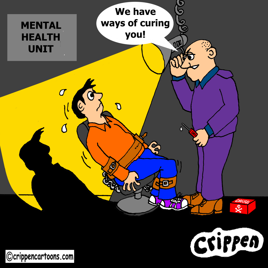 A young white male is strapped to a reclining chair whilst a white, bald thug in a quasi-uniform is shining a strong light in his face. The thug is holding a hypodermic in his other hand and at his feet is a large box with a skull and cross bones and the words drugs printed on it. On the wall, in the shadows is a sign that says Mental Health Unit. The thug is saying: “We have ways of curing you!”