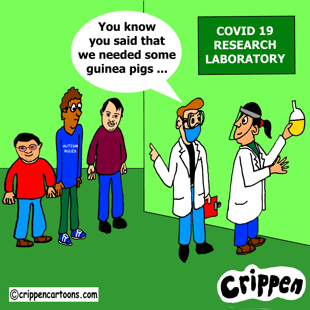 Two figures in lab coats and wearing PPE are stood in the Covid 19 Research Laboratory. Behind them are three disabled people, two with Downs Syndrome and another with Autism Rules on his top. One of the Lab technicians has just noticed them and is saying: “You know you said that we needed some guinea pigs!”