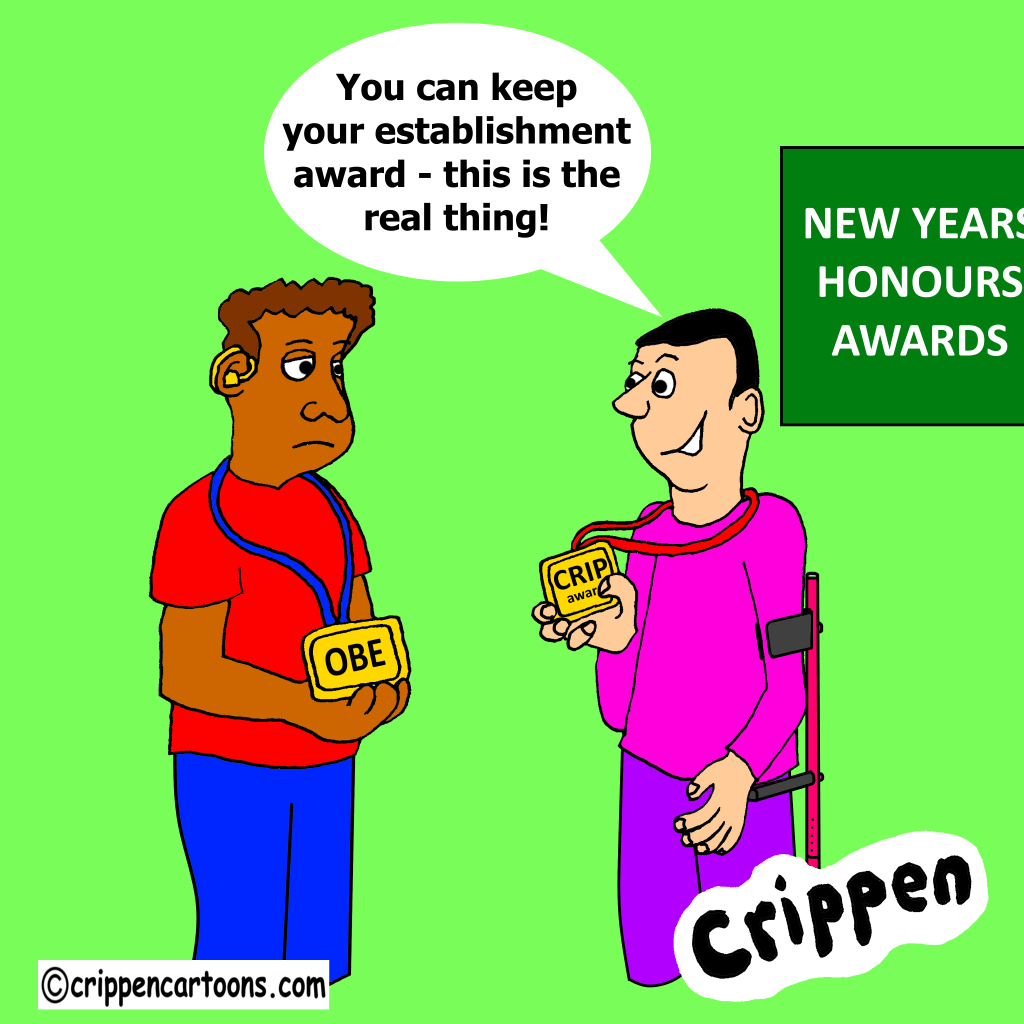 A black guy wearing a hearing aid is clutching a medallion that hangs around his neck. On it is printed OBE. A white guy using an elbow crutch is also clutching a medallion which reads ‘CRIP award’. On the wall behind them is a sign that says ‘New year’s honours awards’. The white disabled guy is saying “You can keep your establishment award – this is the real thing!”
