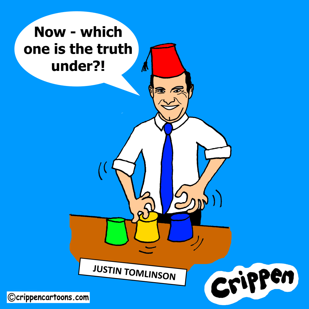 Justin Tomlinson is stood behind a table-top on which he is manipulating three up-turned coloured beakers as in a cup and ball trick. He is wearing a white shirt and blue tie but with a red fez on his head. He is saying: “Now – which one is the truth under?!”