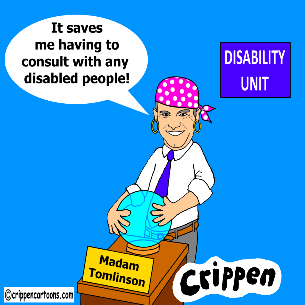 Justin Tomlinson is standing with a crystal ball on a table in front of him. His hands are wrapped around it and he is wearing a head scarf and golden hooped earrings. A sign saying ‘Madam Tomlinson’ is placed in front of him and another sign saying ‘Disability Unit’ is on the wall behind him. He is saying: “It saves me having to consult with any disabled people!”