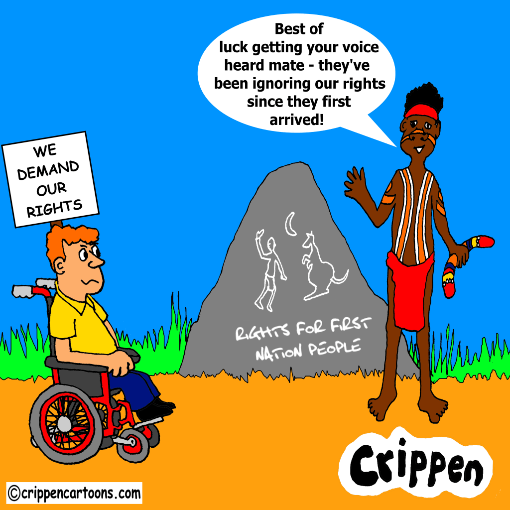 A white wheelchair user with a placard saying ‘we demand our rights’ is sat facing an Australian First Nation person. This person is stood next to a large rock on which is carved First Nation art and the slogan ‘rights for First Nation people’. He is wearing a red headband and loin cloth, carrying a boomerang and also wears traditional body paint. He is saying to the disabled man: “Best of luck getting your voice heard mate – they’ve been ignoring our rights since they first arrived!”
