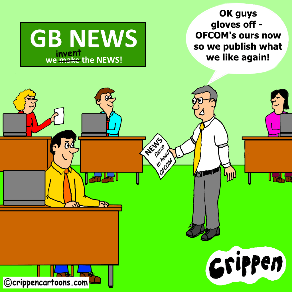 A large newsroom with a sign identifying it as ‘GB News – we make the news’ is filled with journalists at their desks and laptops. The sign has been changed however to read ‘we invent the news!’ An editor has just entered the room with a piece of paper that has ‘News – Darce to head OFCOM’ printed on it. He is saying: “OK guys gloves off – OFCOM’s ours now so we can publish what we want again!”