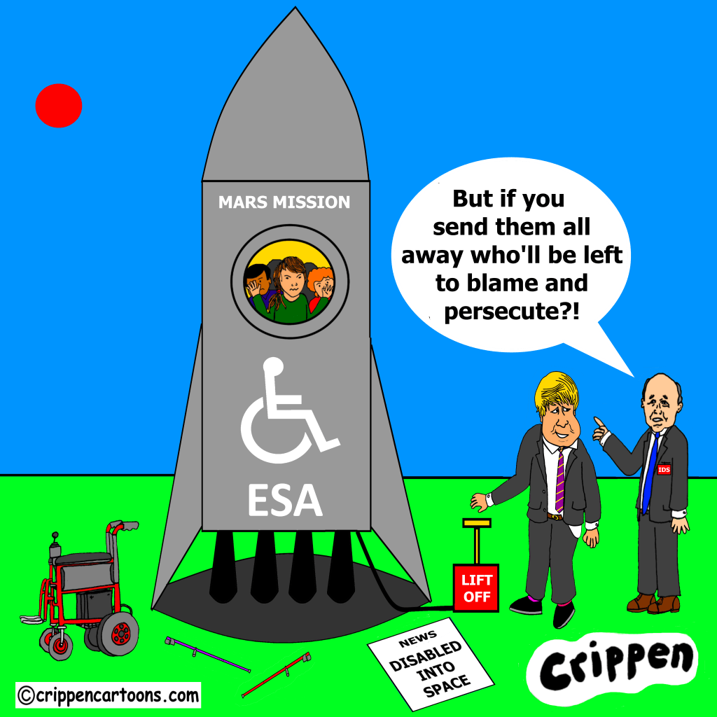 A large rocket is filled with disabled people who are peering out of a large round porthole. Wheelchairs and crutches are scattered on the ground before it. On the rocket is printed ESA (for European space agency), a large wheelchair symbol and the words ‘Mars Mission’. A piece of paper lies on the floor with ‘news – disabled into space’ printed upon it and up in the sky is a large red planet. Boris Johnson is about to press a plunger to send them into space. Alongside of him is Iain Duncan Smith (IDS) who is wearing a name badge and who is saying: “But if you send them all away who’ll be left to blame and persecute?!”