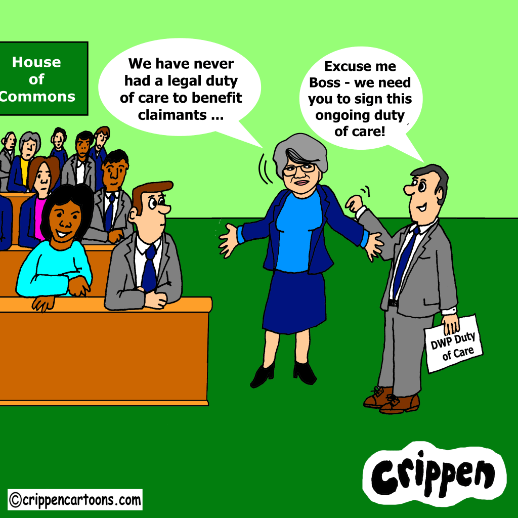 Work and pensions secretary Therese Coffey is standing in the house of commons facing her peers. She is saying: “We have never had a legal duty of care to benefits claimants!”. A colleague is standing behind her and is tapping on her shoulder. He’s holding a document that says ‘DWP duty of care’. He’s saying to her: “Excuse me boss – we need you to sign this ongoing duty of care!”.