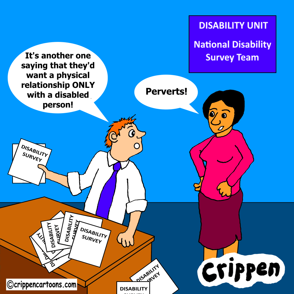 It is the office of the Disability Unit’s National Disability Survey team. A young white man is at a desk covered in returned survey forms. He is holding up a couple in his hands and is saying to an Asian woman who is standing alongside of him: “It’s another one saying that they’d want a physical relationship ONLY with a disabled person!” The Asian woman is replying: “Perverts!”