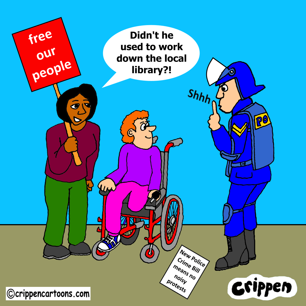 Two disabled protesters are being confronted by a police officer in full riot gear. He has put his finger to his lips and is saying Shhh. One of the protesters, a young Asian woman, carrying a ‘free our people’ placard is saying: “Didn’t he used to work down the local library?!” On the ground at the feet of the policeman is a piece of paper with ‘New Police Crime Bill means no noisy protests’ printed upon it.