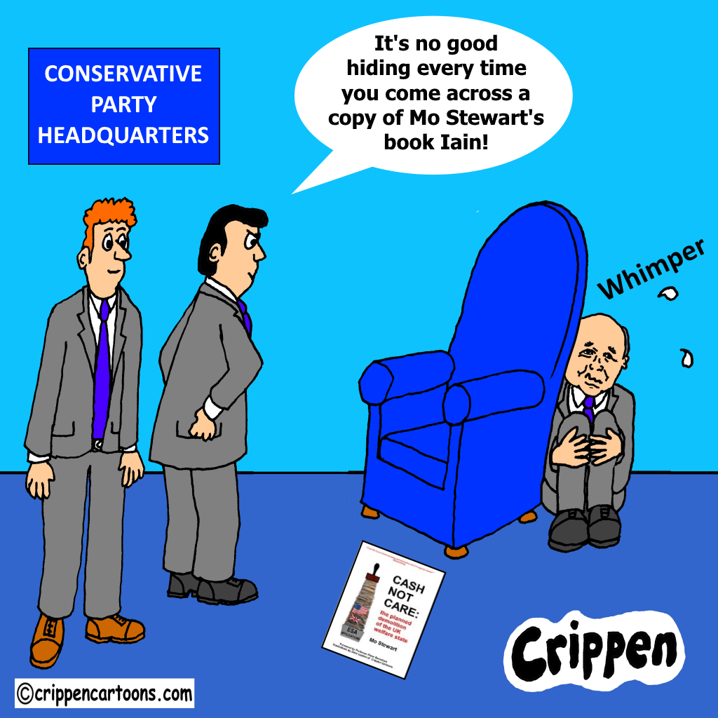 Iain Duncan Smith is whimpering and hiding behind a large stuffed chair in the Conservative Party Headquarters building. On the floor At his feet is a copy of Mo Stewart’s book ‘Cash not Care’. Two colleagues are standing in front of the chair looking perplexed. One of them is saying: “It’s no good hiding every time you come across a copy of Mo Stewart’s book Iain!”