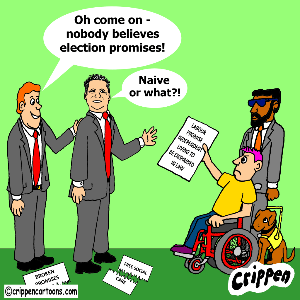 A couple of disabled people are confronting Keir Starmer with his broken promises regarding social care. One of them, a wheelchair user with pink hair is holding up a placard that reads ‘labour promised independent living to be enshrined in law’. Opposite them stands Starmer and a colleague, both wearing identical grey suits and red ties. Starmer’s colleague is saying: “oh come on – nobody believes election promises!” Starmer is saying: “Naive or what?!” On the floor at their feet are a couple of torn up pieces of paper with ‘free social care’ and ‘broken promises’ printed on them.