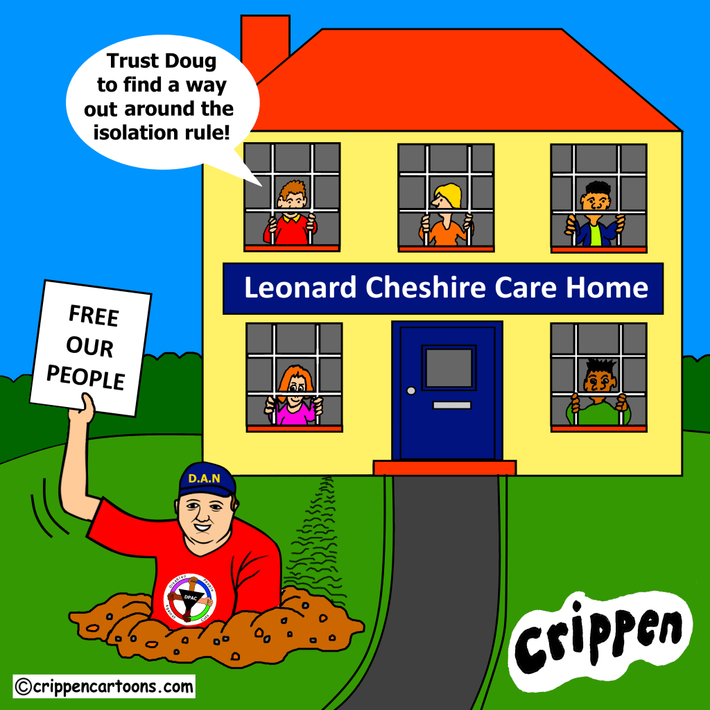 A large Leonard Cheshire care home dominates the landscape. Each window has bars behind which you can see disabled people peering out. There are marks on the ground in front of the building leading to a large hole out of which Doug Paulley is emerging. He is wearing a DAN cap and DPAC t-shirt and is holding aloft a large sign which reads ‘Free our people’. One of the people in a window is saying: ”Trust Doug to find a way out around the isolation rule!”