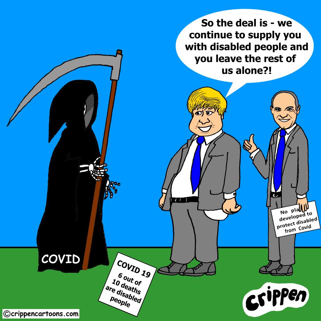 Boris Johnson is standing facing the grim reaper who is clad in his usual black, hooded cloak and carrying his scythe. The cloak has covid printed in white at the bottom and on the ground in front of him is a notice that says ‘Covid 19 – 6 out of 10 deaths are disabled people’. Behind Boris is Justin Tomlinson who stands with his thumb raised in the air and with a sycophantic smile upon his face.  Tomlinson is carrying a card which reads ‘no plans developed to protect disabled from covid’. Boris is smiling at the Reaper and is saying to him: “So the deal is – we continue to supply you with disabled people and you leave the rest of us alone?!”