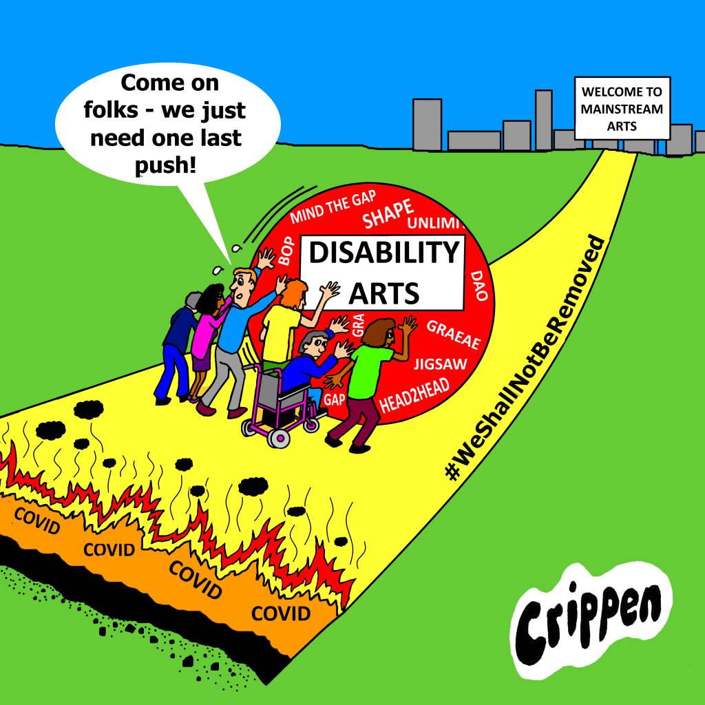 A large red ball representing disability arts and covered with the names of several organisations – Unlimited, Head2Head, Shape, etc., is being pushed by a group of disabled artists up a long yellow road with #weshallnotberemoved printed on its surface. At the end of the road is a large sign that says, ‘welcome to mainstream art’. Just behind them the yellow road is being consumed by flames which are identified as the Covid pandemic. One of the people pushing the ball is saying: “Come on folks – we just need one last push!”