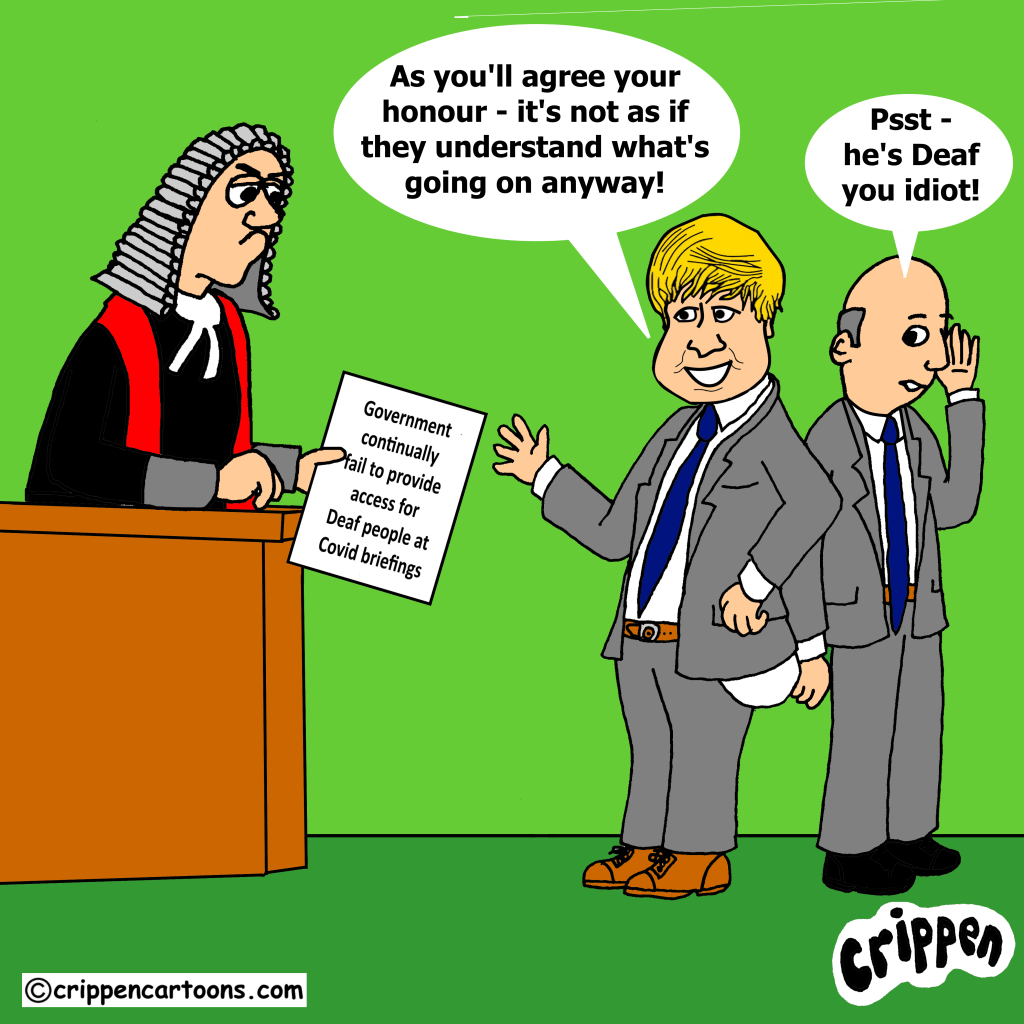 Boris Johnson is standing in front of a High Court judge. The judge is looking angry and is holding a piece of paper which has printed upon it ‘Government continually fail to provide access for Deaf people at Covid briefings’. Boris is saying to him: “As you’ll agree your honour – it’s not as if they understand what’s going on anyway!” Behind Boris is an aid who is whispering to him: “Pssst – he’s Deaf you idiot!”