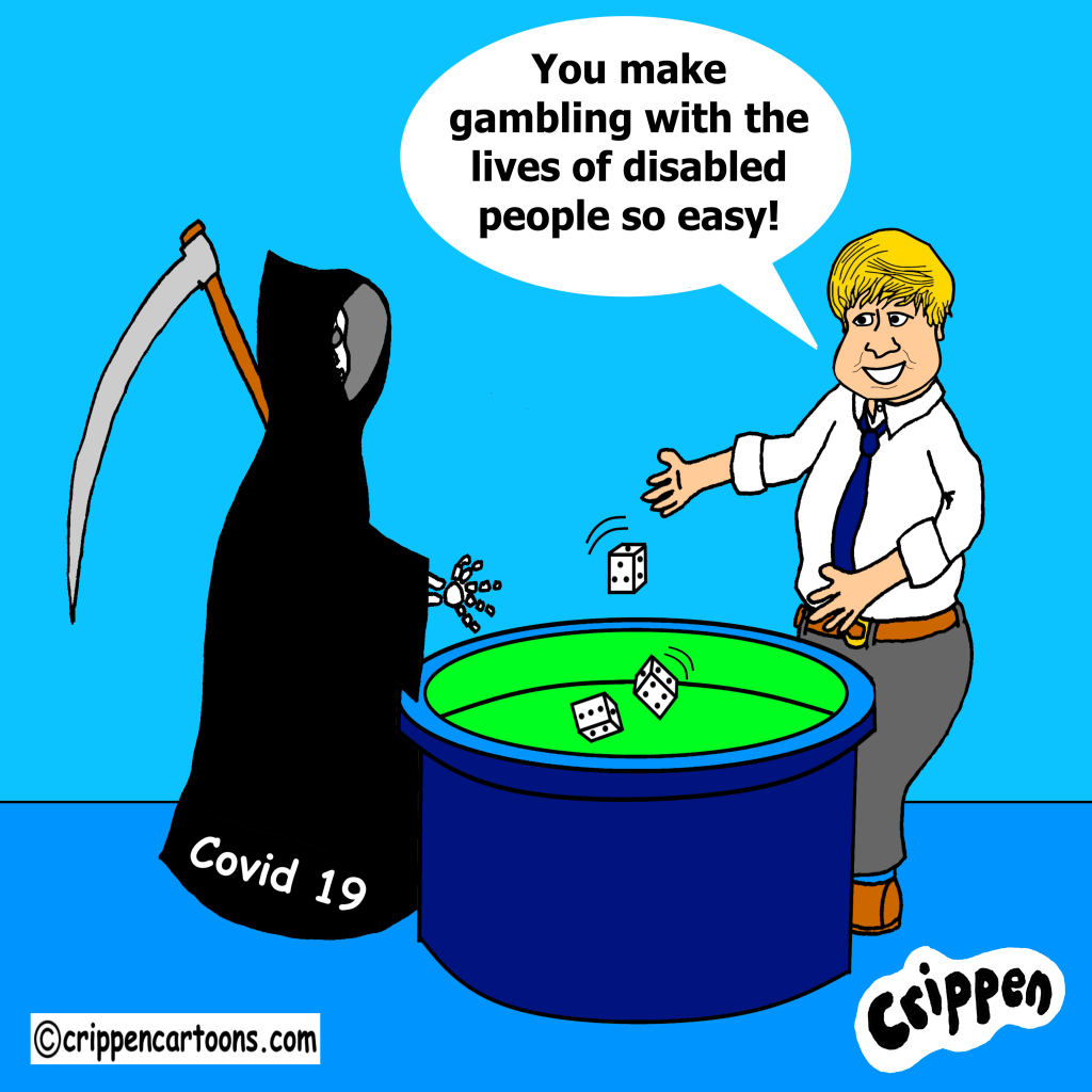 Boris Johnson is playing dice with the Grim Reaper who has Covid 19 printed upon his black cloak and carries his scythe upon his shoulder. Boris is saying: “You make gambling with the lives of disabled people so easy!”