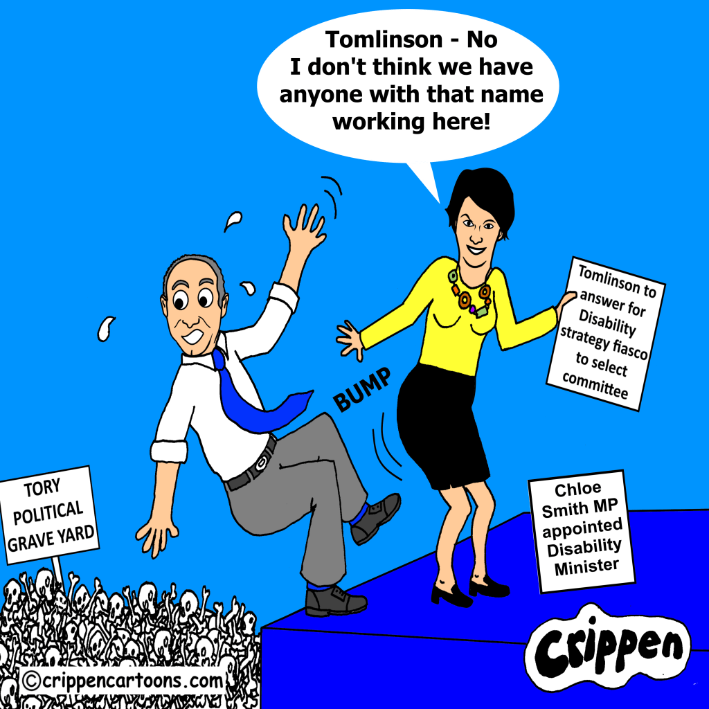 The new minister for disabled people Chloe Smith is nudging the sacked minister Justin Tomlinson off a high ledge. Below him are lots of human skulls and bones identified as the Tory party political graveyard. She is holding a piece of paper on which is written ‘Tomlinson to answer for disability strategy fiasco to select committee’. Another sign at her feet reads ‘Chloe Smith MP appointed disability minister’. She is looking at you and is saying: “Tomlinson – No I don’t think we have anyone with that name working here!”