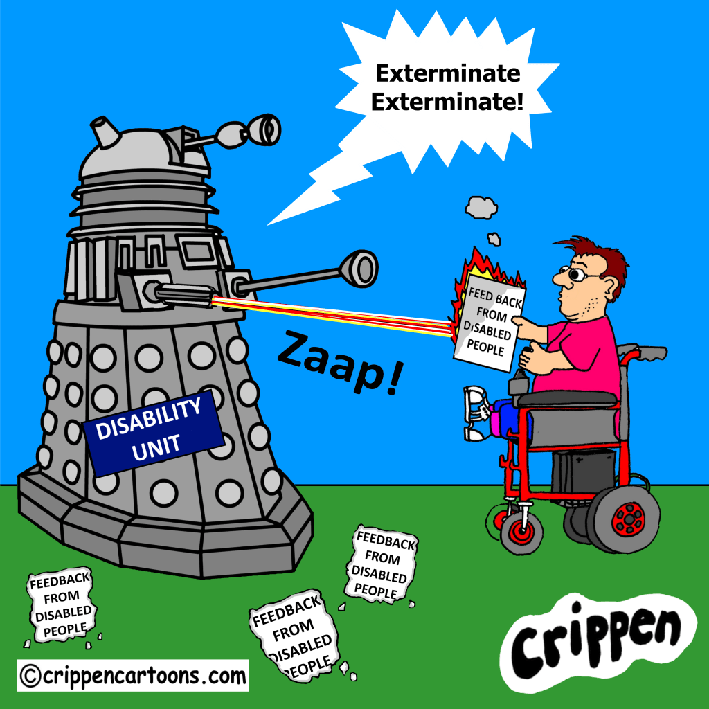 A large grey Dalek is firing its laser gun at a document being held up by a wheelchair user. The document reads ‘feedback from disabled people’ and it is bursting into flames. On the floor around them are several more of these documents with burned edges. The Dalek has a sign upon it that reads ‘disability unit’ and is screeching at the disabled person: “Exterminate, exterminate!”
