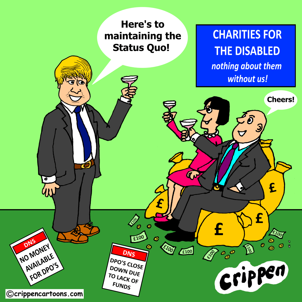 Two white people sit upon sacks of money under a sign that reads: ‘Charities for the disabled – nothing about them without us!’. £100 notes and gold coins are also scattered on the floor by their feet. Opposite them stands Boris Johnson. At his feet are two Disability News Service pages. One reads ‘No money for DPO’s’ and the other ‘More DPO’s close due to lack of funding’. They each have a glass of champagne which they are raising in a toast. Boris is saying: “Here’s to maintaining the Status Quo!”. One of the charity people is saying: “Cheers!”