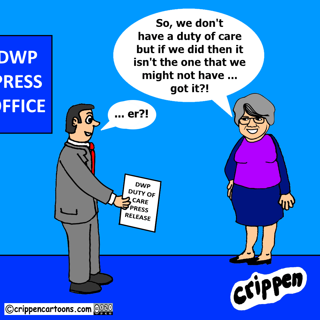 Therese Coffey is standing opposite a man in a grey suit who is holding a DWP press release. On the wall behind them is a sign that reads ‘DWP press office’. Coffey is saying to him: “So, we don’t have a duty of care but if we did then it isn’t the one that we might not have … got it?!” The man, looking bewildered responds with: “ …er?!”