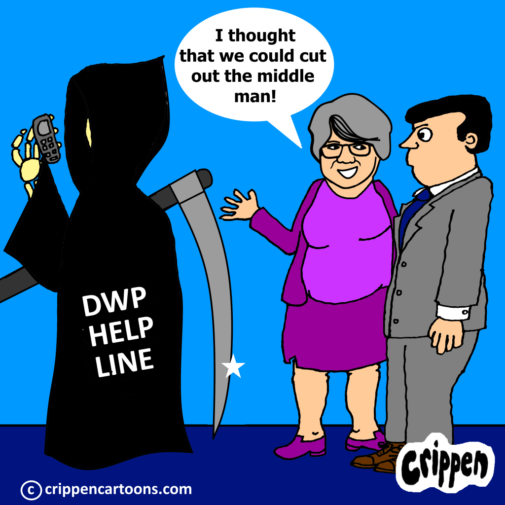 The grim reaper, along with his trademark scythe is standing alongside of Therese Coffey. He is taking phone calls and DWP helpline is printed on the side of his black hooded cloak. Coffey is saying to a man in a grey suit who is standing alongside her: “I thought that we could cut out the middleman!”