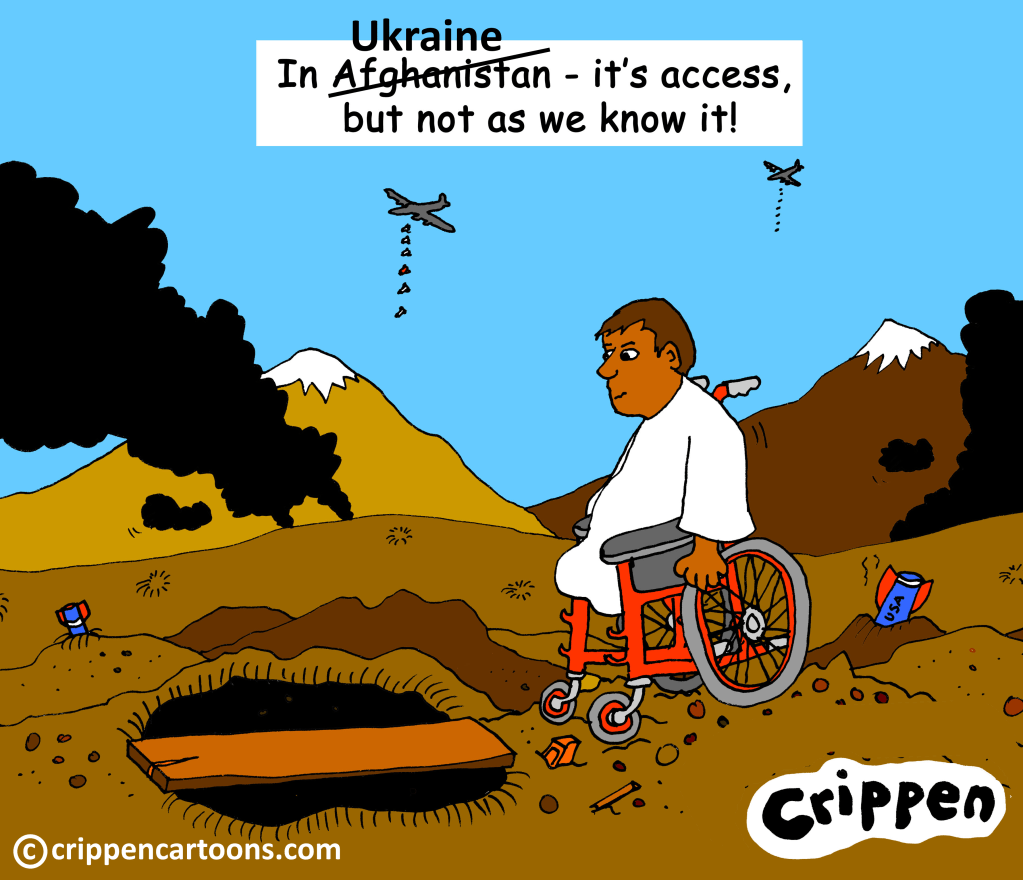 The scene is a war torn landscape with bombers flying overhead and dropping their sticks of bombs. Black oily clouds climbs into the sky alongside bombed out buildings. In the middle is a lone wheelchair user looking down at a single plank laid across a deep bomb crater. A sign over his head reads ‘In Afghanistan – it’s access, but not as we know it!’ However, the word ‘Afghanistan’ is crossed through and written over the top of it is ‘Ukraine’.