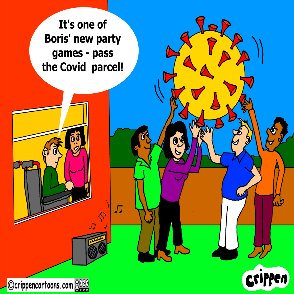 A group of people are tossing a large inflated Covid virus into the air. Music is playing from a small ghetto blaster and they are all laughing and jumping around. Through the window of an adjacent house can be seen two disabled people. One of them is saying: “It’s one of Boris’ new party games – pass the Covid parcel!”