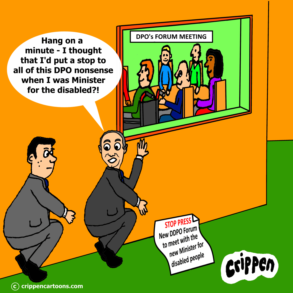 Two white males in grey suits are crouched down below a window through which you can see a meeting taking place. A sign in the meeting room reads ‘DPOs Forum Meeting’. A newspaper page has blown at the feet of the two men. On it is printed: ‘Stop Press – New DDPOs Forum to meet with new minister for disabled people’. The first male crouched below the window is Justin Tomlinson, the former minister for disabled people. He is saying: “Hang on a minute – I thought that I’d put a stop to all of that DPO’s nonsense when I was minister for the disabled?!”