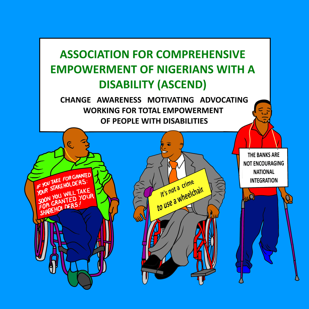 Three black disabled people are in front of a large sign which reads: Association for comprehensive empowerment of Nigerians with a disability (ASCEND)’. Each of the three have a sign around their neck. They read: ‘The banks are not encouraging national integration’ and ‘It’s not a crime to use a wheelchair’